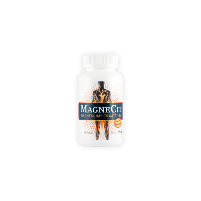 MagneCit on ravintolisä, joka sisältää hyvin imeytyvää kidevedetöntä magnesiumsitraattia sekä B6-vitamiinia. Kidevedetön magnesiumsitraatti on parhaiten liukeneva ja imeytyvä magnesiumsuolamuoto. Kidevedettömällä magnesiumsitraatilla on suurin liukoisuus orgaanisista magnesiumsuoloista. B6-vitamiini tehostaa magnesiumin imeytymistä B6-vitamiinin vähäinen saanti lisää magnesiumin erittymistä virtsaan. MagneCit on kalvopäällystetty jakouurteellinen tabletti, joten se on helppo niellä. Lisääntyneeseen magnesiumin tarpeeseen. MagneCit sopii erityisesti kuntoilijoille ja urheilijoille, ja fyysistä työtä tekeville. MagneCit -tabletti ei sisällä laktoosia, gluteenia, hiivaa, makeutusaineita, soijaa eikä liivatetta. Sopii vegaaneille.