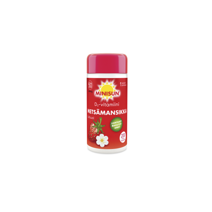 Minisun Metsämansikka 50 mikrog. sopii 11-vuodesta ylöspäin tehostettuun D-vitamiinin saantiin.