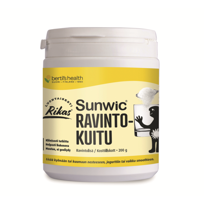 Sunwic Ravintokuitu on neutraalin makuinen jauhe, joka liukenee helposti nesteeseen geeliytymättä. Tuotteen sisältämä kuitu on kliinisesti tutkittua, guarpavuista muokattua liukoista kuitua (PHGG), joka on tärkeää ravintoa suolistomme bakteereille. Sunwic Ravintokuidun säännöllinen käyttö lisää merkittävästi bifidobakteerien määrää suolistossa. PHGG-kuitu aktivoi lisäksi suolistobakteereja tuottamaan useita aineenvaihduntatuotteita, kuten lyhytketjuisia rasvahappoja, propionaattia ja butyraattia. Erityisellä tavalla käsiteltynä PHGG-kuitu sopii FODMAP-ruokavaliota noudattaville. Tuote sopii myös raskauden ja imetyksen aikaiseen käyttöön. Se ei myöskään hidasta perinteisten kuituvalmisteiden tavoin ravintoaineiden ja hivenaineiden imeytymistä.