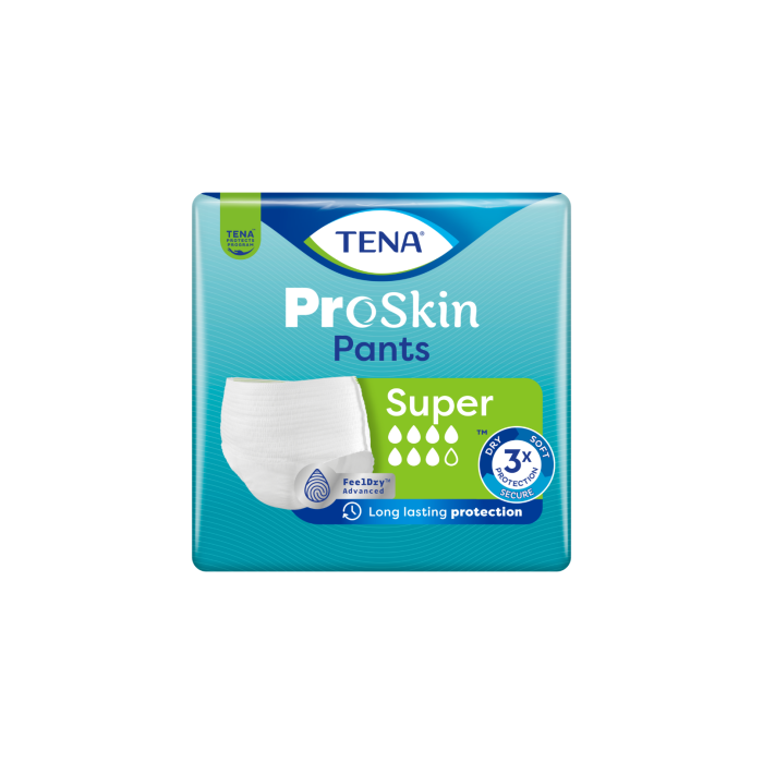 TENA ProSkin Pants Super Inkontinenssibyxor skyddar upp till 100 % mot medelsvår och svår urinläckage. De absorberar snabbt vätskan och håller huden torr länge, både dag och natt. Pålitliga engångsbyxor för dagligt aktivt liv för kvinnor och män.